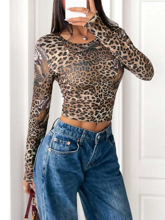 Lace Detail Leopard V-Neck Long Sleeve Top