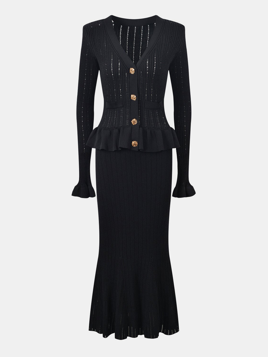 Ruffled V-Neck Top and Midi Skirt Sweater Set
